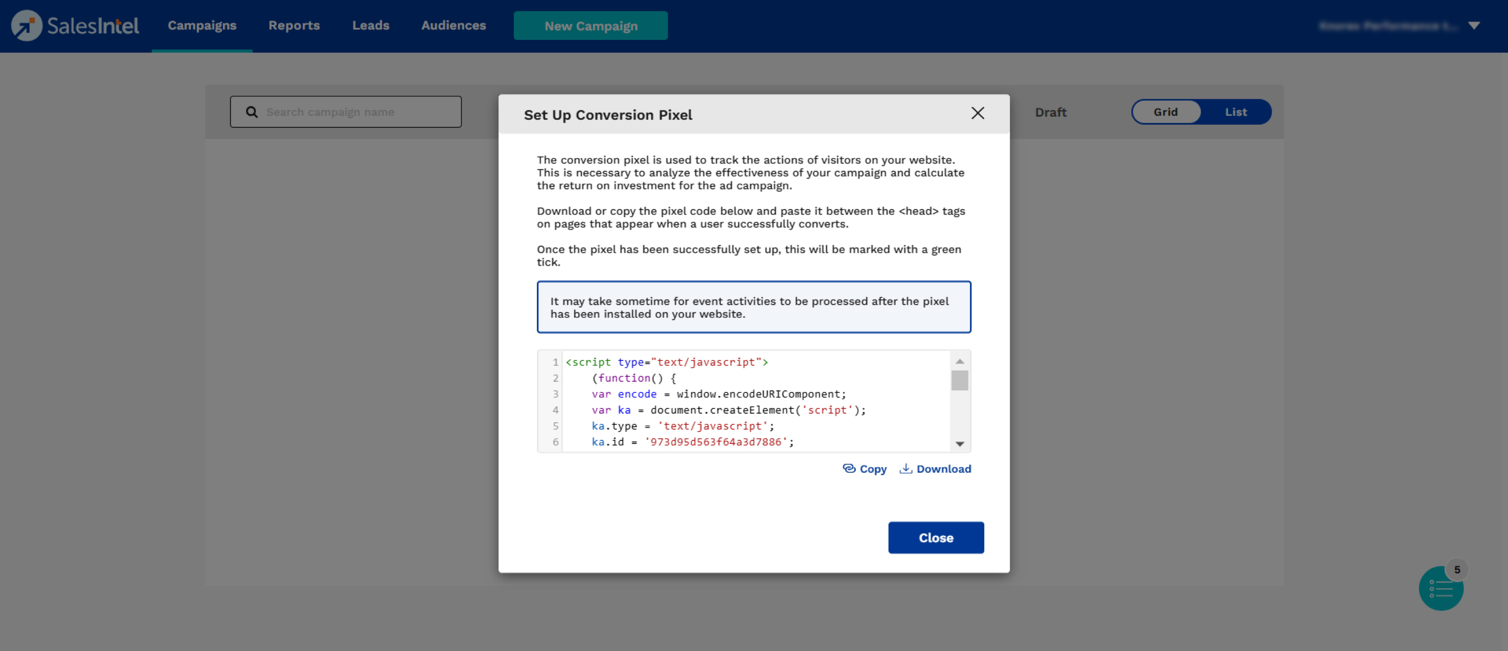 Select either the Copy or Download option for implementing the pixel in tag manager