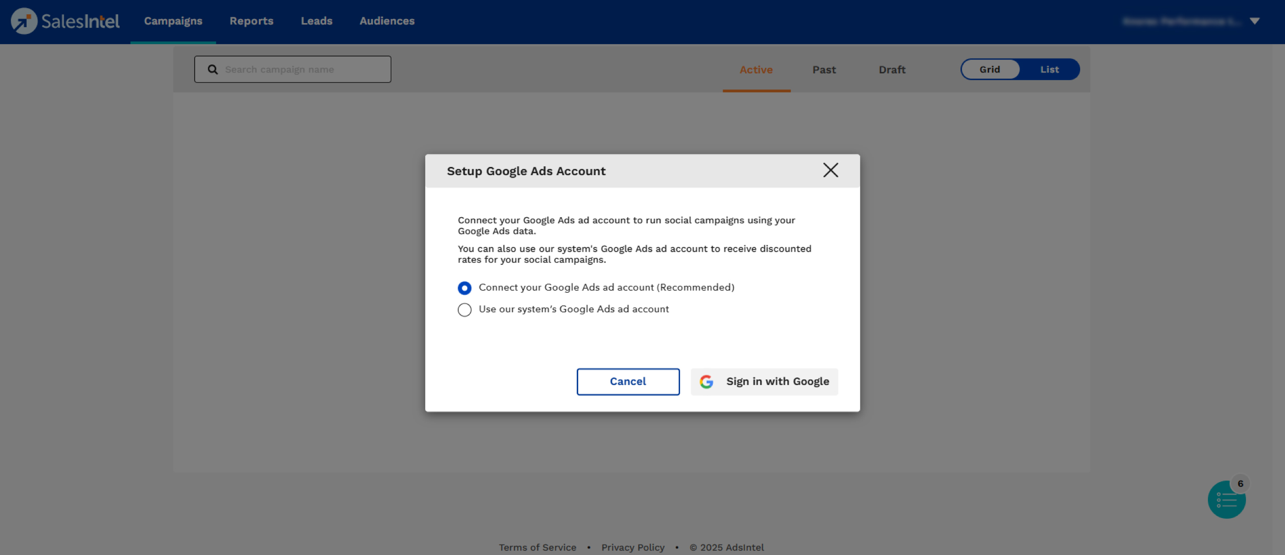 Select either Connect your Google Ads account or Use our system's Google Ads ad account