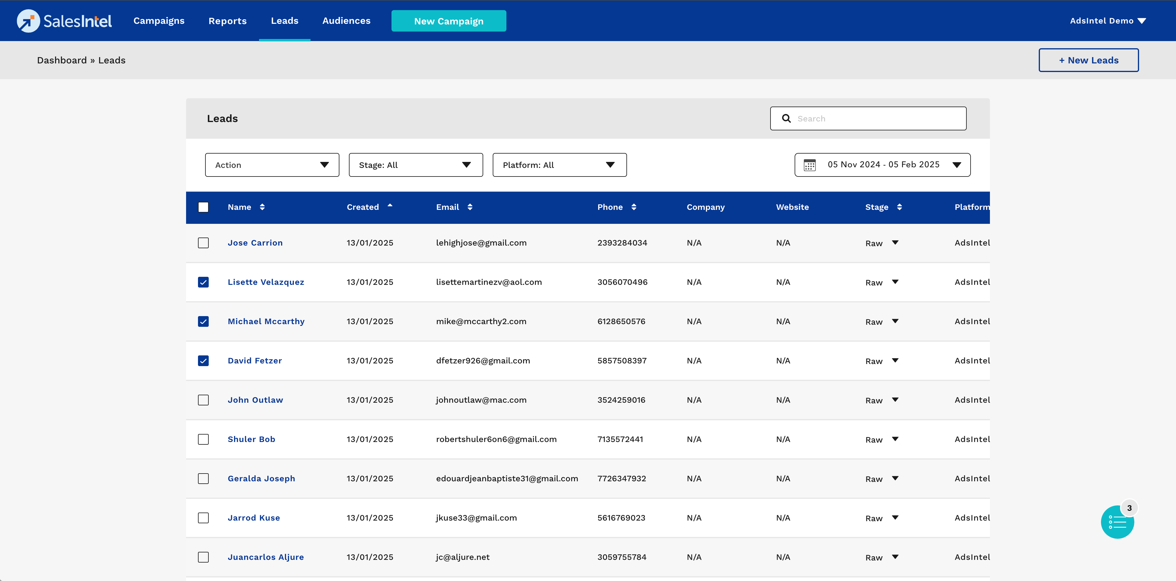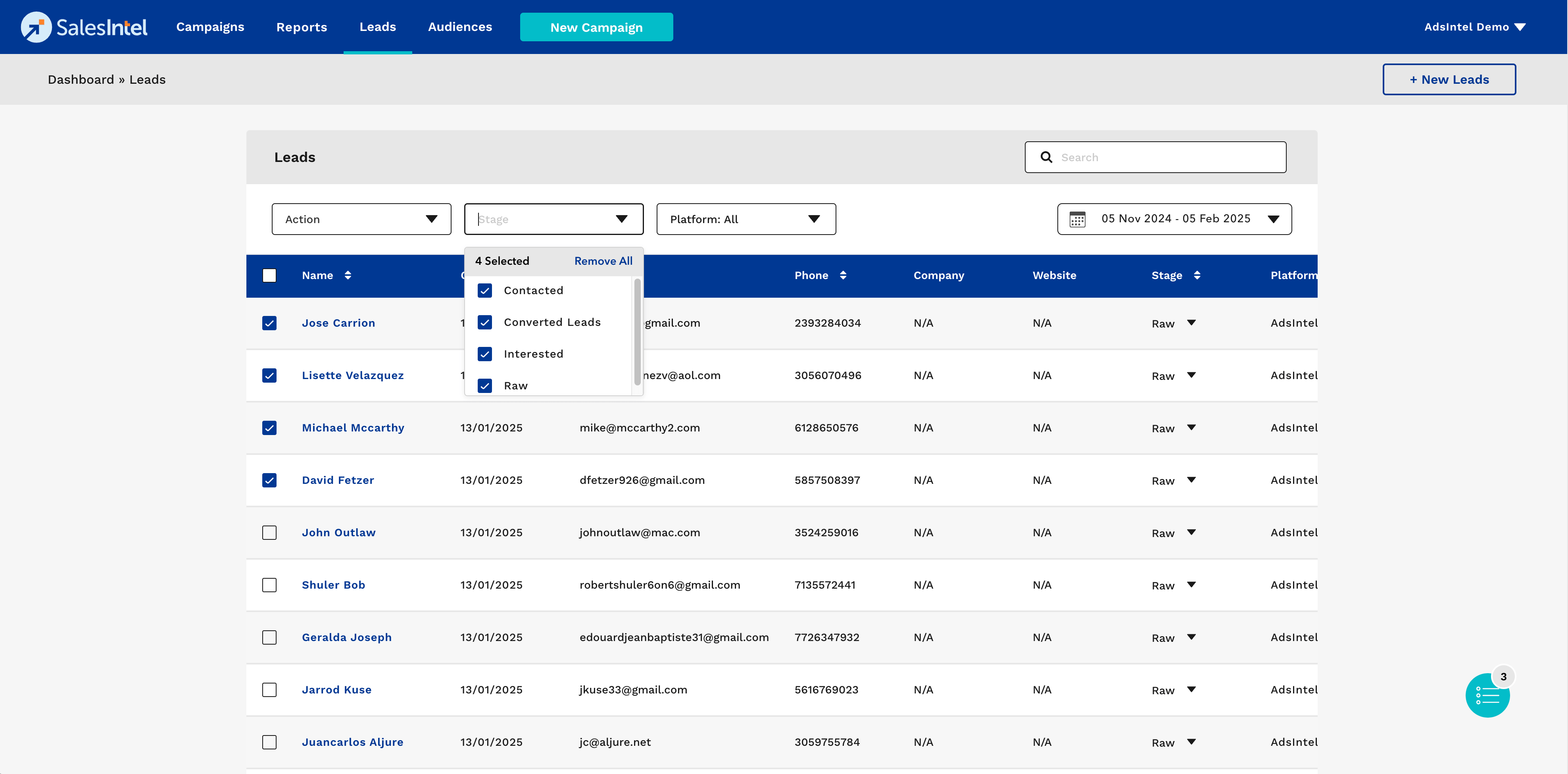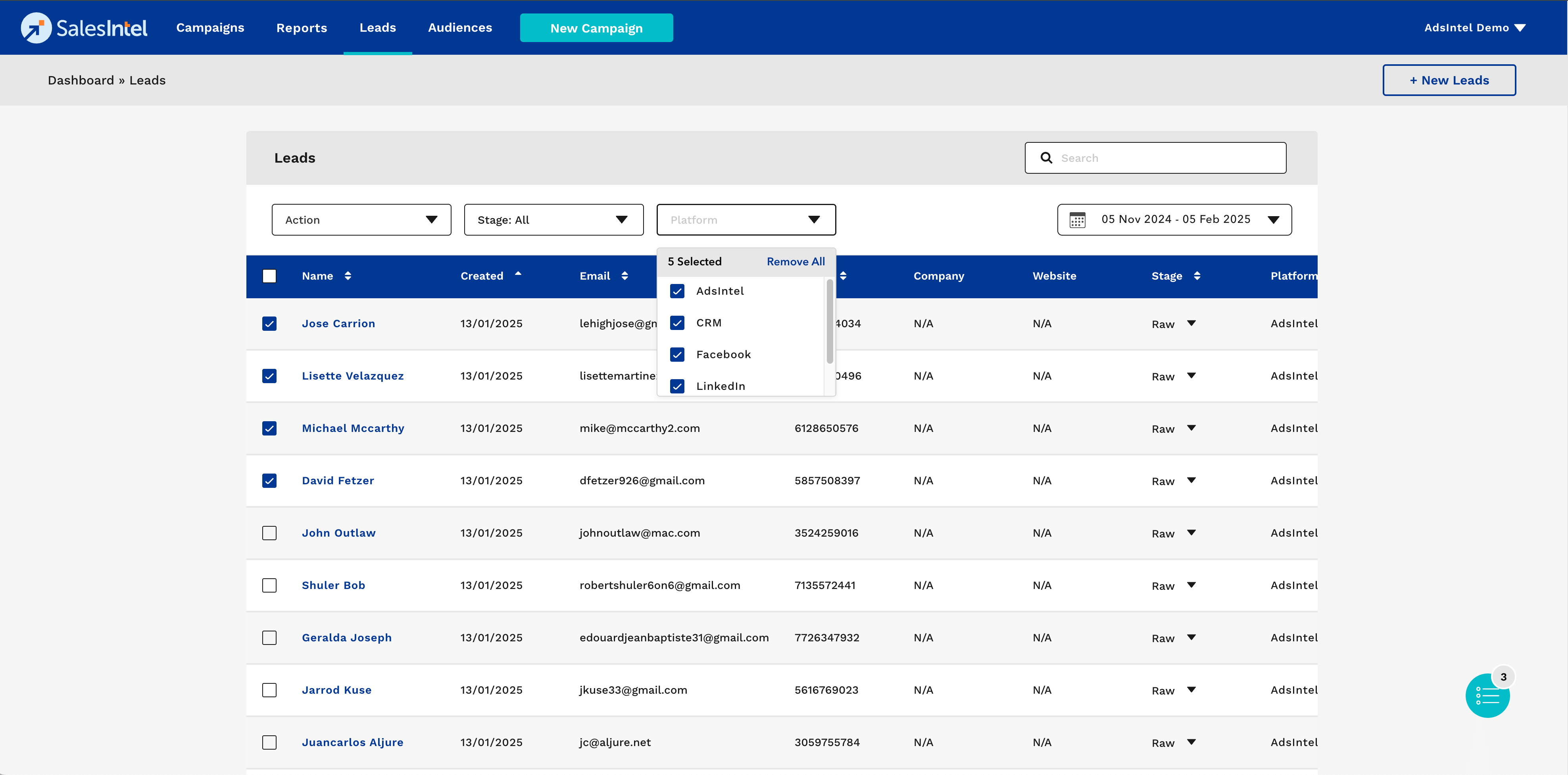 - Each lead entry includes Name, Created Date, Email, Phone, Company, Website, Stage, and Platform.