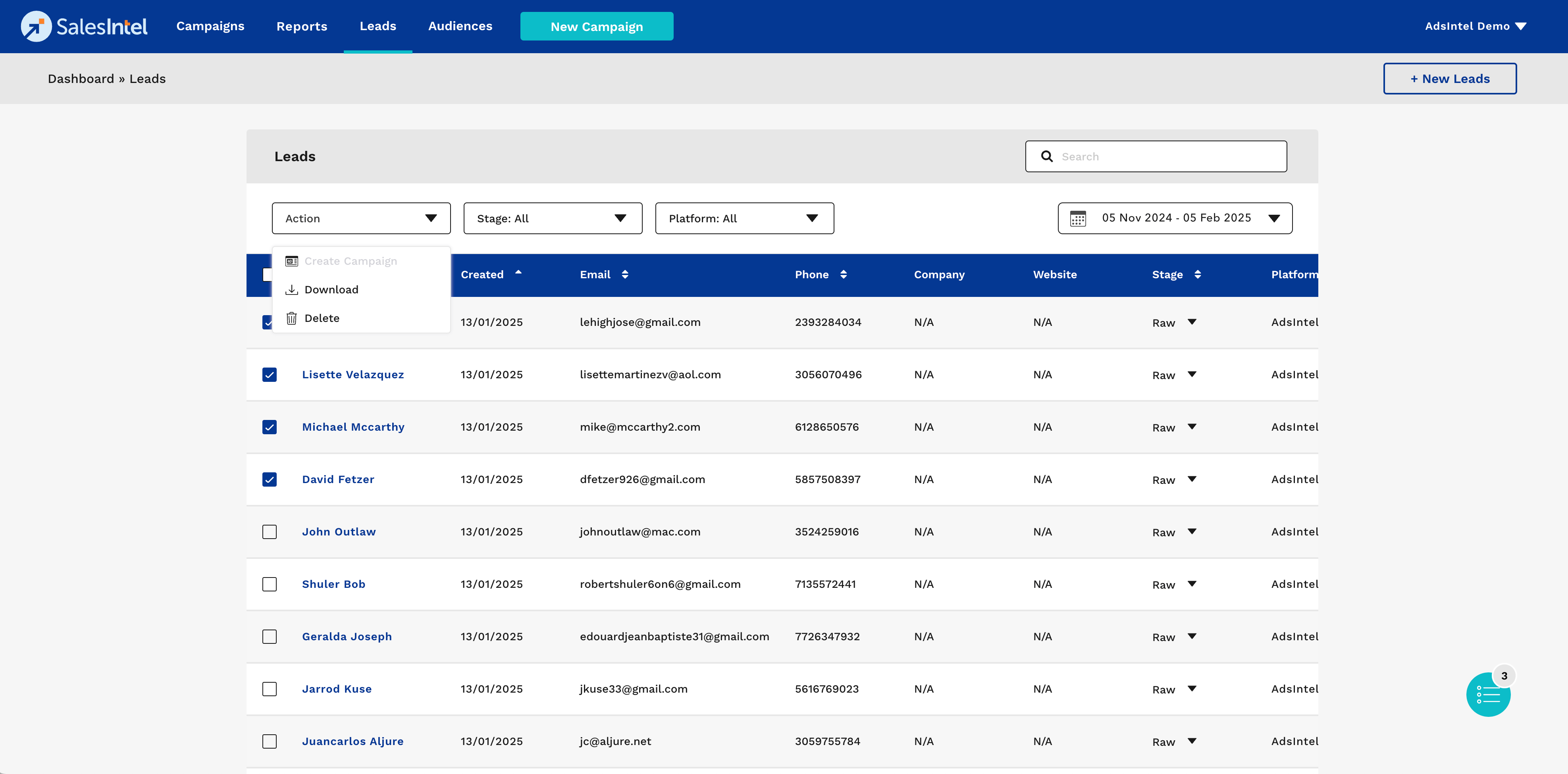 - Click on the **Action** dropdown to choose from available bulk actions (Download, Delete, or Create Campaign).
